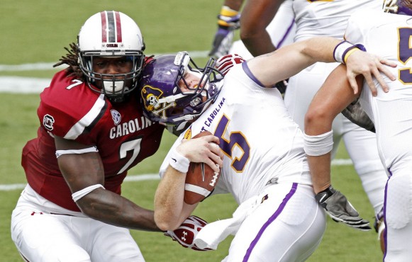 If the ECU offense has a game on its schedule to be a statement game, it is this one. The O will HAVE TO WIN THIS ONE. That OL for South Carolina will make life hard on the defensive front and I expect that USC with that line will dictate the pace of the game…that is, they are looking to win a 28-14 type of game…they do not want to get into a 45-44 type of game…it doesn’t suit their set-up this season. Carden and crew will need to show that they are who we think they are. This means a fast start…we need to put pressure on that defense of the game and jump on South Carolina early. They are going to grind down the defense and score. Equally important to Carden’s ability to distribute the ball, protect it and move the chains, will be All-America candidate Justin Hardy’s game. Not so much in the pass receiving aspect…he will get his catches or he will help others get open. No, moreso in the punt return game…South Carolina struggled in the punting game last year and ECU will need to exploit return opportunities.